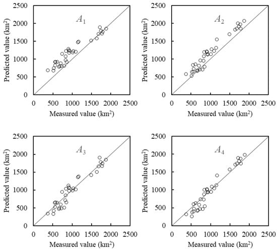 Further, we applied these models (A1, A2, A3 and A4) to predict the water area of the Dongting Lake from 2013 to 2015 (with 34 samples). The measured water area data were extracted from remote sensing images, and the water level information was measured at the respective hydrological stations. As shown in Figure 7, all of the models provided satisfactory performance in predicting water areas of the Dongting Lake. Table 4 shows the performance statistics of these modes. According to the R2, RMSE (Root Mean-square Error), and NSE (Nash-Sutcliffe efficiency), the accuracy of A1 and A2 is lower than that of A3 and A4. This may be due to the fact that the water level and water area of the Dongting Lake have changed significantly in the past ten years (related to the construction of the Water Conservancy Project and terrain changes of Dongting Lake). Therefore, it is difficult to accurately predict the current lake area using the previous data. In contrast, the accuracy of lake area prediction using the most recent years (e.g., 2012) has been greatly improved.