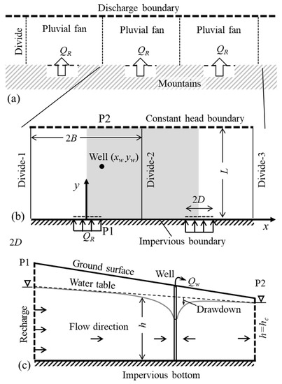 Conceptual model of the unconfined aquifer in a pluvial fan: (a) uniform distribution of pluvial fans in the plan view; (b) a representative area with a pumping well in the gray zone; (c) the profile between P1 and P2.
