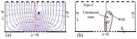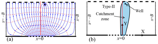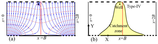 In most of the situations, the pumping well does not significantly change the divergent flow at the regional scale, as shown in Figure 3a, Figure 4a, Figure 5a and Figure 6a, but locally reshapes the streamlines to produce a concentrated flow around the well. This local influence limited the size of the catchment zone in an area with the length along the X-axis that is smaller than 2B. The width of the type-I and type-II catchment zones in the X-direction could be even smaller than 2D, as shown in Figure 3b and Figure 4b. The maximum length of the catchment zone in the Y-direction will reach to L in the type-II and type-IV cases, as shown in Figure 4b and Figure 6b.