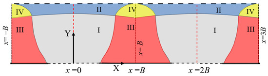 The relationship between the well location and the type of the catchment zone can be shown with a map of well-location zones (Figure 7). For example, when the pumping well is located in the II zone, a type-II catchment zone will be generated. The well-location zones symmetrically distribute on sides of the Y-axis and Divide-2 due to the symmetry of the conceptual model. Therefore, we can focus the investigation on the distribution of well-location zones in a typical area between the Y-axis and Divide-2.