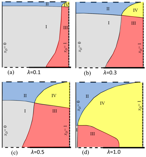 Distribution of the well location zone depends on the control parameters, α, β, γ, and λ, that defined in Equation (7). In particular, Figure 8 shows the change in the well-location zones with the increasing λ value. An increase in the λ value indicates a relative increase in the well pumping rate (Qw), which will reduce the area of the I zone and enlarge the area of the IV zone. When the λ value is small, like that shown in Figure 8a, the II and IV zones will be limited in small areas in the vicinity of the discharge boundary. While if the λ value is close or equal to 1.0, the I zone will significantly shrink to a narrow small area that encloses a short part of the Y-axis, as shown in Figure 8d. The IV zone extends to the X-axis in this situation, indicating that the constant head boundary could be connected with the catchment zone for a well pumped heavy even it is very close to the X-axis.