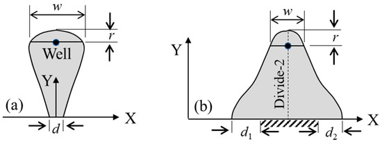 The shape of a catchment zone can be characterized by several geometric elements. For the type-I and type-III catchment zones with a well on the Y-axis or Divide-2, typical shape factors are defined as that shown in Figure 9. The type-I catchment zone in Figure 9a collects water from a single inflow segment where the source head width is d [L]. In fact, the d value is determined by the necessary contribution of recharge from the source head to the well, which can be expressed as