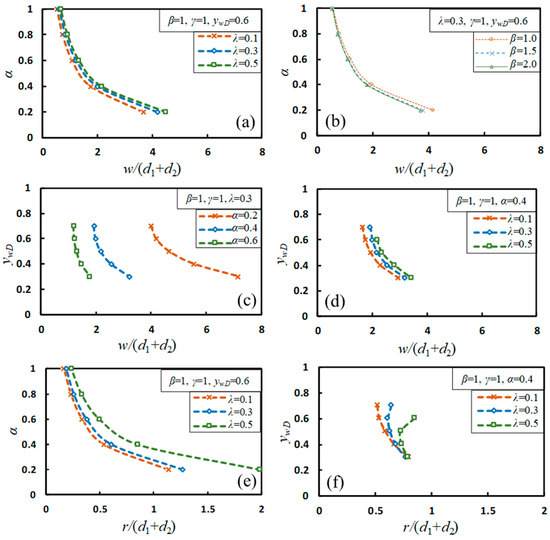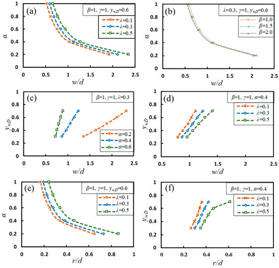 Dependency of dimensionless shape factors on control parameters for xwD = 0 in the type-I catchment zone: (a) Curves of w/d versus α with different λ values; (b) Curves of w/d versus α with different β values; (c) Curves of w/d versus ywD with different α values; (d) Curves of w/d versus ywD with different λ values; (e) Curves of r/d versus α with different λ values; (f) Curves of r/d versus ywD with different λ values.