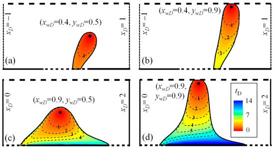 Distributions of the dimensionless travel time around the pumping well are typically shown in Figure 12 for the four types of the catchment zone. In general, the travel time increases with the distance from the starting point to the well but the change patterns are not uniform. When control parameters are fixed, the maximum travel time for particles on the source head increases when the catchment zone changes from type-I to type-IV, due to the increase in the maximum length of streamlines linking the source head and the well. A capture zone is enclosed by a contour of travel time (tD = 1, 2, 3, etc.) in the map. In the type-I and type-II catchment zones shown in Figure 12a,b, the capture zone could be significantly stretched to the upstream area along the middle line between the sides of the catchment zone. In the type-III (Figure 12c) and type-IV (Figure 12d) catchment zones, this stretch effect also exists for relatively small travel times, whereas the capture zone will be stretched to the upstream area along the sides of the catchment zone for relatively large travel times, because the double source heads are not in the middle. The capture zone will be preferentially stretched toward a closer recharge boundary when the pumping well is not rightly located at Divide-2.