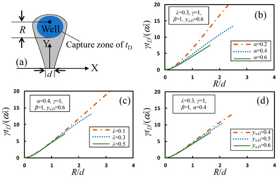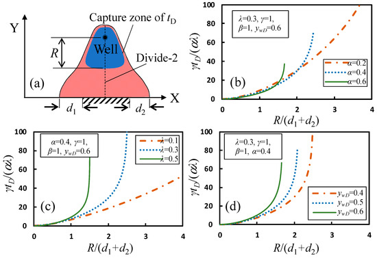 Figure 13b–d show curves of γtD/(αλ) versus R/d for capture zones in the type-I catchment. As indicated, γtD/(αλ) is almost linearly dependent on R/d. An increase in the α value will cause a decrease in the slope of the curve, as indicated in Figure 13b. The slope of curves also decreases with the increasing λ value, as shown in Figure 13c, but the response is not significant as that influenced by the α value. Figure 13d shows that the curves are not sensitive to ywD even the increase in ywD could increase the slope. It is clearly indicated that the relationship between γtD/(αλ) and R/d, i.e., the function F(R/d), is almost independent on λ and ywD when R/d is less than 1.0 but still significantly depends on α. Different curves of γtD/(αλ) versus R/(d1 + d2) are shown in Figure 14b–d for capture zones in the type-III catchment. Unlike those shown in Figure 13, these curves are significant nonlinear. When R/d is less than 1.0, the curves are close to each other and are not sensitive to the changes in α, λ and ywD. Otherwise the curves are significantly influenced by these parameters. Note that the intersection of the X-axis and Divide-2 is a stagnation point for the Type-III catchment, which limits the value of R/(d1 + d2) but leads to an infinite tD value because of the tiny Vy value in the vicinity of the stagnation point. As a result, the curves are approximately vertical to the horizontal axis when R/(d1 + d2) is close to the maximum value. According to Equation (18), both α and λ increase d1 + d2 so that the bound of R/(d1 + d2) decrease in Figure 14b,c, respectively, with the increasing α and λ values. However, an increase in the ywD value will enlarge the range of R and consequently increase the bound of R/(d1 + d2), as shown in Figure 14d.
