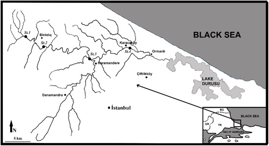 - Karacaköy Stream (St.4)-41°23′58.0560″, 28°23′00.6720″; the stream bed and depth vary depending on seasons (3–16 m width and 11–45 cm depth), and the substrate is mostly sandy (rarely boulders and cobbles) (Figure 1).