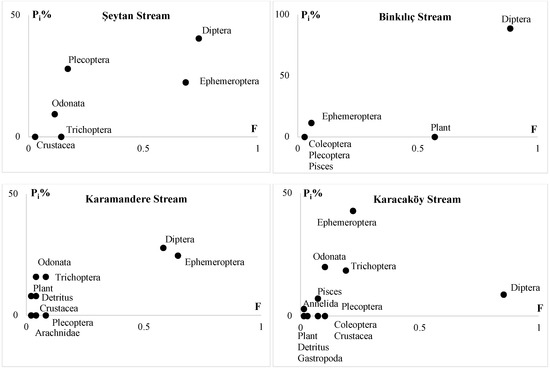 | Preys | Şeytan Stream (St.1) (n = 35) | Binkılıç Stream (St.2) (n = 35) | Karamandere Stream (St.3) (n = 48) | Karacaköy Stream (St.4) (n = 68) | ||||