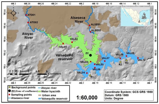 Although there are some works related to natural wetlands in which results regarding the concentrations of PTMs are presented, only a few of them evaluated the effect of self-purification in a global way. Valsequillo reservoir located in Puebla City was titled as a Ramsar site (No. 2027) in 2012 as it sustains important fauna and flora—especially Water hyacinth plants—that occupy around 50% of the total area. It has been the receptacle of municipal and industrial wastes for the past few decades that gravely affected the water quality []. Therefore, the present work aims to evaluate the Valsequillo Ramsar as a biofiltration system, which carries out a self-depuration process though the action of Water hyacinth plants covering the reservoir. For that purpose, the concentration of thirteen PTMs (As, Ba, Cd, Co, Cr, Cu, Hg, Mo, Ni, Pb, Ti, V and Zn) in water, Water hyacinth plants (E crassipes) and sediments were determined. In addition, the indices and factors mentioned above were also calculated to determine both the quality of the sediments and the ability of the Water hyacinth plants to absorb and transfer PTMs to the different parts of the plant.