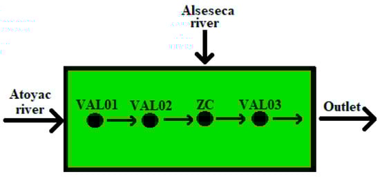 In the present work, we conceived a biofiltration system on which along with the absorption of PTMs by Water hyacinth, several processes occur which lead to the removal of PTMs from the water. The simplified biofiltration system (coverage of Water hyacinth plants on Valsequillo reservoir) is comprised by two inlets (Atoyac River and Alseseca River), three intermediate points (VAL01, VAL02 and VAL03), a zone of confluence (ZC) between VAL02 and Alseseca River and finally an outlet (Figure 2). Due to the difficulty in accessing the part of the reservoir between the sampling point ALSE02 and VAL03, those points were not considered in the simplified biofiltration system. However, it must be taken into account that the entries to the system through the rivers (sampling points ATO02 and ALSE02) and the outlet of the system (VAL03–VAL10), are the most important for the dimensioning proposed here.