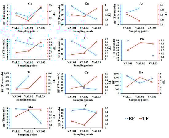 Bioaccumulation factor (BF) and Translocation factor (TF) along sampling points (VAL01, VAL02 and VAL03).