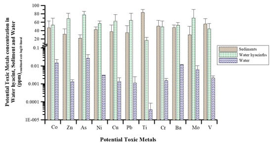 Another important route of metal sedimentation is through the absorption of metals by plants and their subsequent death. This can be corroborated since, there is no significant difference (p > 0.05) in the content of metals in sediments and in the Water hyacinth plants for Co, Zn, Ni, Cu, Pb, Cr, Ba, Mo and V. Moreover, mean metal content in Water hyacinth plants is significantly higher than in sediments for As (p < 0.05) (Figure 4). This could imply, as reported by some authors [,] that as with Hg and Selenium (Se) [], Arsenic (As) in the Water hyacinth plants is undergoing a process of phytovolatilization before it dies.