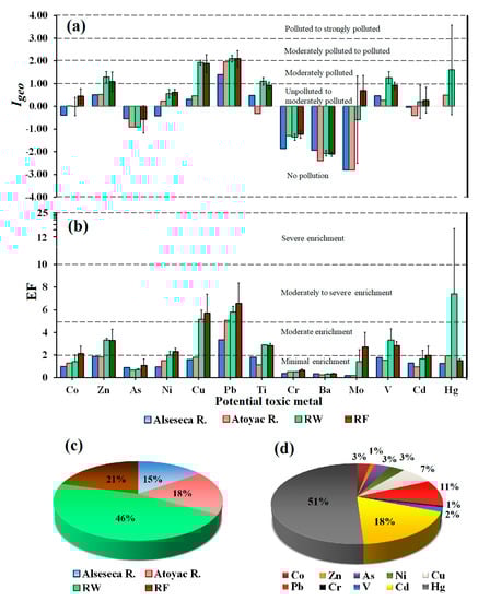 The results of EF and Igeo for Hg are in accordance with the Potential Ecological Risk Index (PERI), as the PERI of RW, RF, Atoyac River and Alseseca River were (all values are dimensionless) 330, 148, 130 and 109, respectively. According to the categories of Hakanson [], there is a low risk in the sediments of the rivers and in RF. Nevertheless, in RW there is a considerable risk, mainly due to the elevated values of Hg in that particular zone (Figure 5c,d). These results pointed out the importance of managing the sediments in the reservoir, as they pose a threat to the water quality due to the constant interchange of matter.