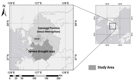 We conducted a case study in the southern Seoul metropolitan area in Korea, called Gyeonggi Province. This study area is located between 36°50′ N and 37°35′ N latitudes and 126°30′ E and 127°35′ E longitudes (Figure 1), has been severely affected by unprecedented droughts during the spring from 2015 to 2017.