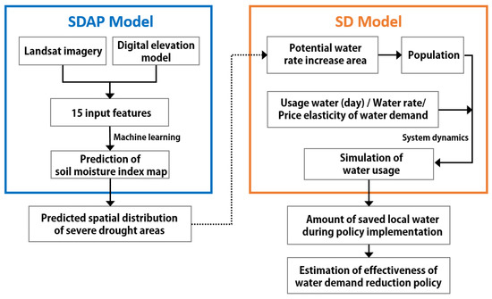 This study has the framework of two linked models, as shown in Figure 2, which is a structure that simulates policy by SD model based on the result of SDAP model [13]. The SDAP model (Figure 3) predicts the spatial distribution pattern of soil moisture after non-rainfall period using drought function trained by random forest (RF) algorithm [13]. The SD model (Figure 4) estimates the amount of water available to the provincial government by simulating the price increase policy for the drought-tolerant areas predicted in the previous process. We estimate the effectiveness of the policy through the estimated amount of water resources.