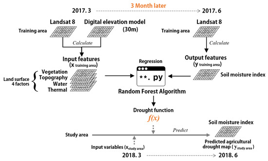 Agricultural drought was trained and predicted by the following concept [13]. The soil moisture after non-rainfall periods remains different depending on the condition of the present land surface [20]. In this regard, we classified the land surface factors that affect the soil moisture into four categories: vegetation, topographic, water, and thermal factors during the non-rainfall period [13]. Thermal factors reduce soil moisture, whereas vegetation retards the loss of soil moisture by slowing down the increase in land surface heat [21]. Topography is another important determinant of soil moisture [22]. The land initial conditions such as existing water-containing state are also related to the soil moisture remaining after a drought period [20]. Thus, the present environmental conditions, such as these land surface factors, being regressed on the soil moisture after the non-rainfall period will make enable the short-term drought prediction of soil moisture.
