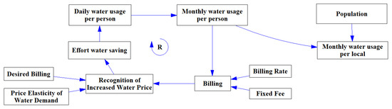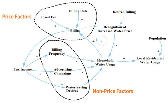 Figure 7 presents our proposed combination model including price and non-price factors that may be helpful for future research to develop a plan and understand the relation between reducing water demand and human actions. This SD model includes non-price factors that can be used to reduce water demand, such as increasing the billing frequency by using tax incomes generated from the increased water rate, implementing water-saving campaigns to raise awareness, and supplying water-saving household devices (such as water-saving faucets and toilet seats), which would thereby lead to effective water saving. However, these causal relationships along with the concepts and ideas depicted on the graph are beyond the scope of this research.