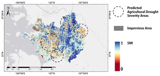 As a result of applying the SDAP model, we found four potential severe drought area and have confirmed that five farmland areas within the study area had a lower SMI than other areas, excluding the impervious areas (dark gray section in Figure 5). Following this, four water sources that are used in the four predicted agricultural drought severity areas (five administrative districts) were identified. The water sources are shared by nine administrative districts, including the four severe drought areas [18].