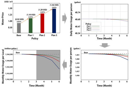 We have assumed three policies based on increased water price. The base rate is 0.92 USD/m3, which is the same as the current rate. Plan 1 was increased by 120% from the base rate to 1.10 USD/m3; Plan 2 was increased by 140% to 1.28 USD/m3; and Plan 3 was increased by 160% 1.46 USD/m3. We then ascertained the amount of water saved for the three-month period by changing the individual water use of each plan. In particular, in Table 2, the desired billing implies the desire that the water billing will return to the previous level, thus the desired billing is calculated using the base rate.