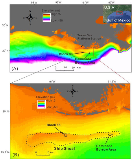 Ship Shoal is located off the central Louisiana coast (Figure 1), which is in the eastern portion of the late Holocene shoreline [32]. On the inner shelf, which has a depth shallower than 10 m, the gentle southern slopes and steep northern slopes of Ship Shoal indicates an active northward shoal migration. This shoal is approximately 50 km long and varies between 5–7 km in width, as delineated by the 6-m isobaths (Figure 1). The 6-m isobaths of the shoal are located in a high-energy environment where currents and waves mobilize well-sorted sandy sediment. Sediment on top of this shoal is mainly comprised of clean quartz sand [8]. It is a high-priority sand resource for the restoration of the Isles Dernieres barrier island chain, Caminada–Moreau headland, and Timbalier Islands, all of which suffered a high rate of land loss in recent decades [33,34,35].