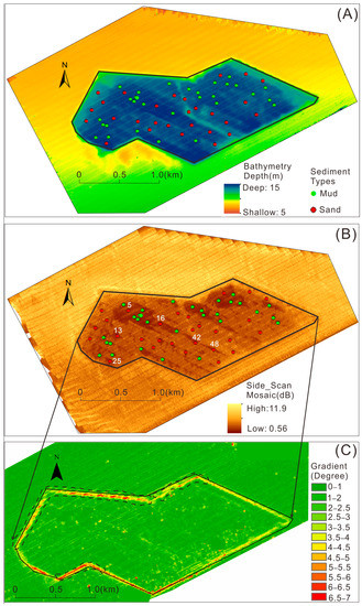 Bathymetric and side-scan sonar data were used to quantify the seafloor morphology and topography of the study area. Bathymetric data from a post-dredging survey in August 2018 were processed in CARIS HIPS and SIPS v.11.2 (Teledyne CARIS, Canada) (Figure 2A). The bathymetric data were referenced to an NOAA station at the Texas gas platform (Figure 1A), Caillou Bay, Louisiana (LA). Side-scan mosaics with backscatter values were first generated in CARIS and then exported into ArcMap (Figure 2B). Details of the processing and analysis of bathymetry and backscatter data can be found in Obelcz et al. [14] and Liu et al. [21].