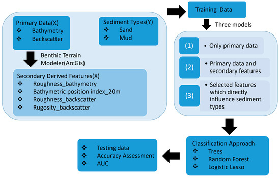 In this study, Random Forest, Decision Tree, and Regularized Logistic Regression with Lasso penalty (hereafter abbreviated as Logistic Lasso) were run using randomForest, rpart, and glmnet packages in R, respectively (Figure 3). The data were randomly split into training (80%) and test (20%) sets. The models were fitted using the training samples only, while the test samples were used to evaluate the models’ predictive performance. The results were based on a total of 250 random splits of the data. The accuracy rate and AUC (Area Under the Curve) score were used to evaluate the model performance [45]. Accuracy is defined as the proportion of samples that were correctly classified for the test set. AUC, which is based on the Receiver Operating Characteristic (ROC) curve, provides an aggregate measure of performance across all the possible classification thresholds. A model whose predictions are totally incorrect has an AUC of 0.0; one whose predictions are all correct has an AUC of 1.0. In our models, each sample contained (1) primary features: bathymetry (m) and backscatter data (dB), and (2) derived secondary features: BPI_20, Roughness_bathymetry, Roughness_backscatter, and Rugosity_backscatter. Each classification method in this study was trained three times using different combinations of features: (1) all six features, (2) only primary features (bathymetry and backscatter), and (3) a subset of features chosen by the Random Forest algorithm.