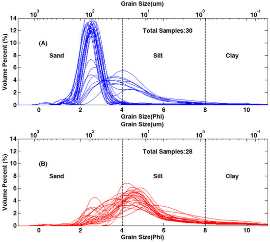 The grain size distributions of a total of 58 samples from Caminada pit are shown in Figure 3A,B. The majority of the 30 sandy samples within the pit contain about 90% sand and 10% silt, with modes around 100 µm (Figure 4A). However, there are a few sandy samples whose modes are near 63 µm. The grain sizes of the other 28 samples indicate the dominance of silt with modes around 15 µm (Figure 4B). On average, the sand, silt, and clay represent 21%, 75%, and 4%, respectively, with silt being the largest fraction.