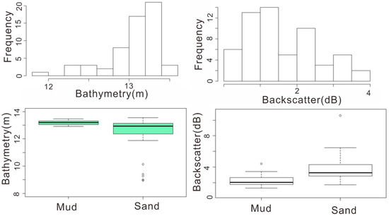 The training samples showed that the bathymetry of samples range from 9 m to 13.5 m, and most of the data are between 12.0–13.5 m (Figure 5A). The backscatter data revealed a sampling of values between 0–5 dB (Figure 5B), with the majority being in the 2–3 dB (Figure 5B). Further exploration of the sediment types of training data showed that, in general, coarser sediments were associated with higher backscatter and shallower water depths (Figure 5C,D).