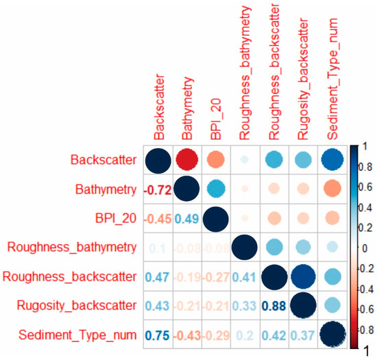 The correlation matrix shows that backscatter and bathymetry have a strong correlation with sediment types, and the absolute values are both greater than 0.43. Backscatter and all the corresponding derived features indicate a positive relationship with sediment types, whereas bathymetry and BPI_20 have a negative relationship with sediment types (Figure 6). It shows that a higher backscatter value with shallower water depth is prone to be classified as sand. The four derived features show autocorrelation with their original primary features. The Random Forest method was applied 10 times to calculate the variable importance (Table 2). The results indicate that backscatter, roughness_bathymetry, and rugosity_backscatter bathymetry were the most significant features that were included in the model with a subset of features.
