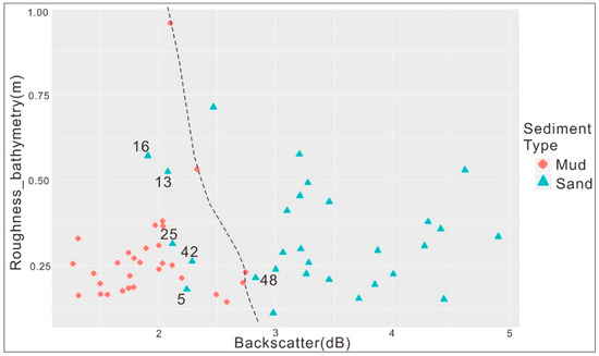 Partial dependence plot of backscatter and Roughness_bathymetry. The dotted line is the classification boundary between mud and sand. Backscatter and Roughness_bathymetry are the two most important features to classify the sediment types.