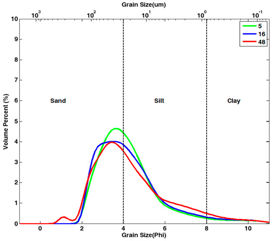 Grain size distributions of three sandy samples with the grain size near the classification boundary. Numbers 5, 16, and 48 are sample IDs. See the locations of these samples in Figure 2B.