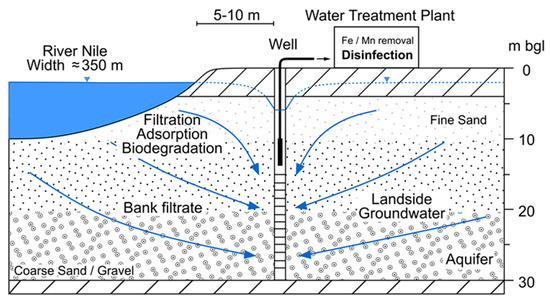 Riverbank filtration is the abstraction of water from aquifers that are hydraulically connected to the river, through pumping wells adjacent to the river [8]. The pumping lowers the groundwater table, such that the river water infiltrates into the aquifer. The bank filtrate percolates through the aquifer sediments towards the production wells, where it mixes with groundwater. Figure 1 shows an RBF cross-section with typical conditions from Upper Egypt. Favorable conditions include a good hydraulic connection between the river and the aquifer, erosive river flow conditions to prevent riverbed clogging, sufficient aquifer thickness (>10 m) and hydraulic conductivity (K > 1 × 10−4 m/s), and a low natural (pre-RBF) gradient of groundwater flow towards the river [8,9,10]. Such favorable hydrogeological conditions for RBF have been identified for Upper Egypt [11].