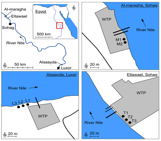 - Ghodeif, K.; Paufler, S.; Grischek, T.; Wahaab, R.; Souaya, E.; Bakr, M.; Abogabal, A. Riverbank filtration in Cairo, Egypt—Part I: Installation of a new riverbank filtration site and first monitoring results. Environ. Earth Sci. 2018, 77, 270. [Google Scholar] [CrossRef]