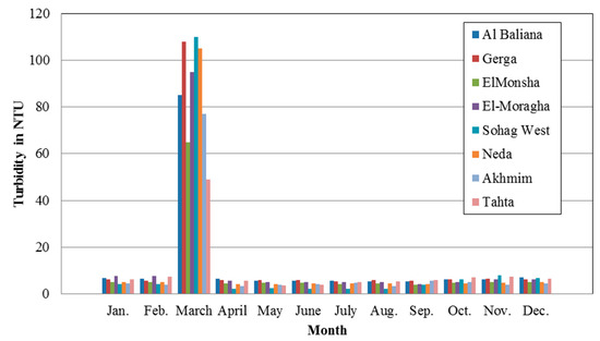 The significant influence of heavy rains on the water turbidity of river water is shown in Figure 4, where the spike in March was caused by heavy rain.