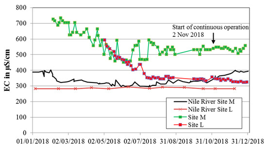 EC readings during the initial phase of RBF near Luxor, site L, and Sohag, site M, 2018.