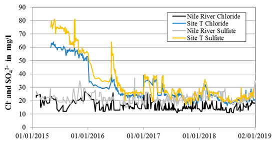 Chloride and sulfate concentration during the initial phase of RBF at Sohag, site T, 2015–2018.