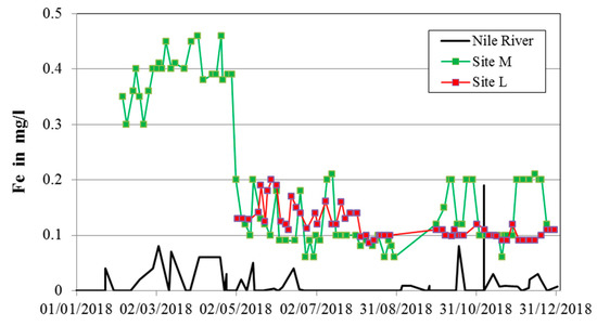 Fe concentration in the pumped RBF well water, during the initial phase of RBF near Luxor, site L, and Sohag, site M, 2015–2018.