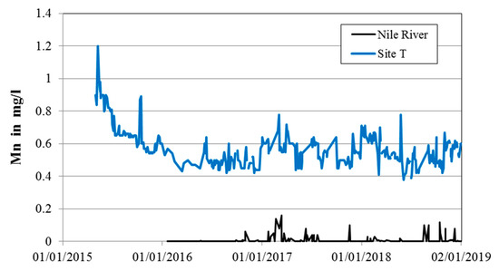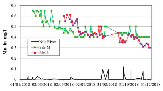 The lowest final Mn concentration was observed at site L near Luxor (Figure 10), where the portion of bank filtrate was the highest and nearly continuous operation was ensured. This indicated that continuous operations and a short residence time of bank filtrates in the riverbed and the aquifer prevented the release of Mn due to redox processes along the flow path.