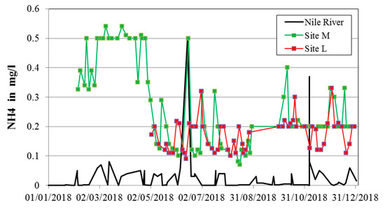 Figure 11 shows a decrease in ammonium concentration in the pumped well water at Sohag, site M. Here, RBF resulted in lower ammonium concentrations compared to the abstraction of groundwater. Ammonium concentration in groundwater at site L near Luxor was already lower. At Sohag, site T, the initial ammonium concentration was 0.5 mg/L, the same as at site M, decreasing to about 0.1 mg/L in 2017, and afterwards fluctuating between 0.05 and 0.4 mg/L, with a median of 0.12 mg/L in 2018. After the initial phase, all data were below the permissible limit of 0.5 mg/L for ammonium, according to the Egyptian Drinking Water Standard. The final ammonium concentrations of 0.1–0.2 mg/L did not cause problems during disinfection.