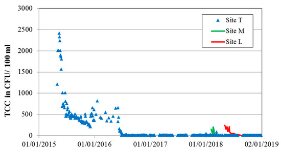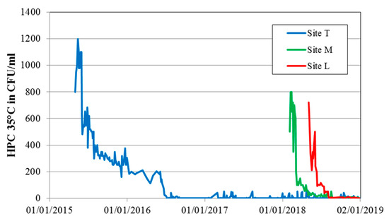 Figure 12 shows remarkable changes in the bacteria (heterotrophic plate counts (HPC)) found in the pumped RBF well water. The high levels at the start of the operation, at sites M and L, could be a result of disturbance of conditions in the subsurface, and contamination during drilling and well construction. If the upper soil enters the borehole or is even used as a filling material, (non-)fecal bacteria are released and can cause a higher HPC, until a microbiological equilibrium is achieved and biofilms are stabilized in the aquifer and the vicinity of the well. The results from site T were different in the beginning but did not indicate any contamination by sewage, as the coliform and fecal coliform counts were very low after one year of no fully continuous operation. After the initial phase, the HPC decreased to median values of 2–20 CFU/mL, compared to a median of 1900 CFU/mL in river water. The permissible limit of the HPC bacteria, according to the Egyptian Drinking Water Standards, is 50 CFU/mL.