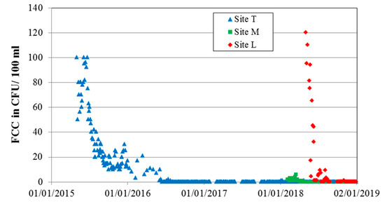 The contamination during the drilling and well installation was also obvious from the observed total and fecal coliforms, during the initial phase shown in Figure 13 and Figure 14. The long-lasting effect at site T was unacceptable whereas at site M (low contamination) and site L the pumping resulted in a clean-up of the disturbed aquifer within 2 to 3 months. After the initial phase, an effective removal of coliforms and fecal coliforms was proved, with a very low number of positive detections of coliforms (Table 4). Despite this, disinfection is a required post-treatment step. During the initial phase, the dosage of disinfectants (e.g., chlorine) should be higher to ensure safe drinking water supply. This might also be required during floods, when the riverbed is eroded and the travel time of bank filtrate is shorter, due to a higher gradient.