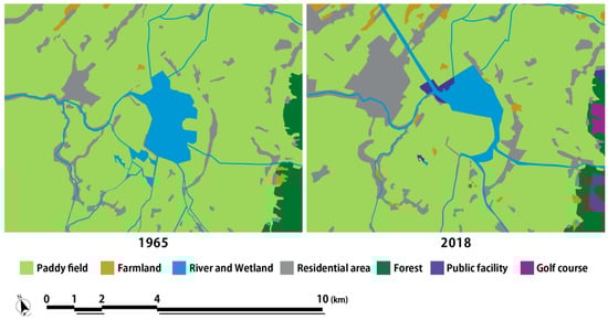 Figure 3 shows the situation of land use in the target area as of 1965 and 2018. The changes in land use ratio between 1965 and 2018 are as follows: paddy fields decreased from 83.7% to 78.2%, farmlands increased from 0.4% to 1.3%, river and wetland areas decreased from 6.9% to 5.0%, residential areas increased from 5.0% to 11.3%, forests decreased from 3.9% to 2.7%, public facilities increased from 0% to 0.4%, and golf courses increased from 0% to 1.1%.