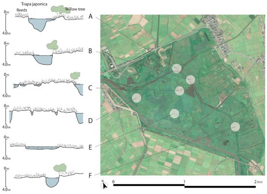 Figure 4 shows a cross-sectional view including the water depth of Fukushima Lagoon investigated by the authors in August 2018 and its locations. There were many abandoned farmland areas near the residential area, however, based on this investigation there were many wetlands with various water depths inside the Fukushima-gata lagoon.