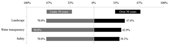 Figure 7 shows the ratio of answers to “no change in the Fukushima-gata lagoon before and after the reclamation project”. We examined whether there were differences depending on the number of years of residence from the viewpoints of landscape, water transparency, and safety. The ratio of households who had lived there for more than 50 years and answered that the Fukushima-gata had not changed before and after the state drainage was low from all viewpoints.