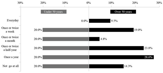 The frequency of visits to Fukushima-gata lagoon after the reclamation project was defined as an indicator clearly showing attachment to the Fukushima-gata lagoon in this paper. We assumed that any household visiting the Fukushima-gata lagoon, regardless of their frequency, had a sense of affection toward the Fukushima-gata lagoon. Households that answered “do not go at all” had no attachment to the Fukushima-gata lagoon. Figure 8 shows the ratio of answers to frequency of visit by residence years after the reclamation project. The obvious difference between more than 50 years and under 50 years was the ratio of answers stating "every day". The other answers did not have obvious differences.