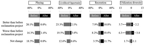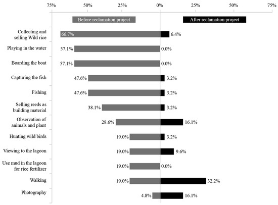 The actual situation of the use of the Fukushima-gata lagoon before and after the reclamation project is described in Figure 9. You can see the detail of the actual situation of use of Fukushima-gata lagoon before and after the reclamation project in Table A3. The trends were divided into those whose frequency had dropped sharply after the reclamation project (collecting and selling wild rice, playing in the water, boarding the boat, capturing the fish, fishing, selling reeds as building material, hunting wild birds, using mud in the lagoon for rice fertilizer), those whose frequency had dropped slightly after the reclamation project (observation of animals and plants, viewing the lagoon), and those whose frequency had increased after the reclamation project (walking, photography).