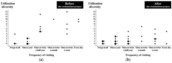 Figure 10 shows the cross-tabulation results of the degree of attachment to the Fukushima-gata lagoon and the actual situation of utilization of the Fukushima-gata lagoon before and after the reclamation project. You can see the detail of the extent of attachment Fukushima-gata lagoon and actual use situation of Fukushima-gata lagoon in Table A4 and Table A5. There was no difference in the response ratio of each question item based on the extent of attachment among households that showed attachment. On the other hand, households with a high degree of attachment tended to have higher usage diversity before the reclamation project in terms of utilization diversity, and households with “everyday” use tended to have an average utilization diversity before the reclamation project of 9.5 (standard deviation 0.7); households whose visiting frequency was nil had an average utilization diversity of 0.8 (standard deviation 1.8) before the project.
