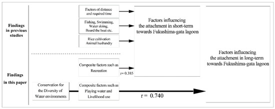 In addition, due to differences in the use of the Fukushima-gata lagoon after the reclamation project by the subjects of the interview survey, we classified the use of the Fukushima-gata lagoon as "playing in the water", "livelihood opportunity", and "recreational use". As a hypothesis based on the above, we assumed Hypothesis 3—the factors of playing in the water, livelihood opportunities, and recreational use are involved in forming long-term attachments towards the Fukushima-gata lagoon.