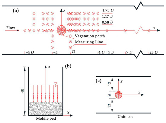 Experiments were conducted in a straight Plexiglas flume with a 16 m long, 0.3 m wide, 0.4 m high, and 1.62 m long test section at the State Key Laboratory of Hydraulics and Mountain River Engineering (SKLH) of Sichuan University, China. A plate gate was arranged at the tag end of the flume, which was used to maintain uniform water flow. Next, a funnel was equipped upstream of the plate gate and a filter screen with a valve at the bottom was connected to collect sediments. We mounted a 3D acoustic Doppler velocimeter (ADV) (Nortek, Bærum, Norway) measuring bracket and a probe system on the sink rail. In addition, fiberglass circular cylinders were used to simulate the rigid and non-submerged vegetation unit. We arranged the vegetation of a single plant into a circular vegetation patch in the staggered pattern, which was then arranged into the punched plexiglass base plate. Table 1 presents all test setup parameters.