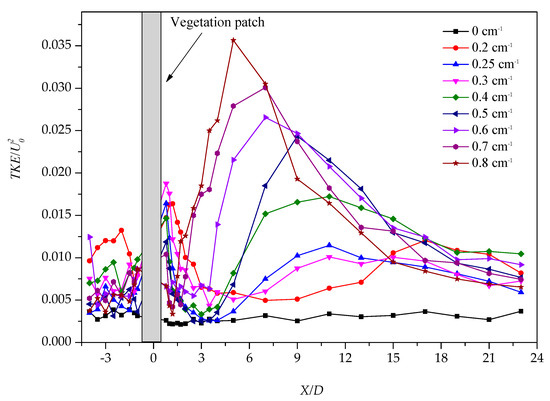 Owing to the impact of different vegetation densities, the first peak simultaneously appeared at 0.8 D. We observed that the height of the peak increased as the vegetation density increased, suggesting that the denser patch could cause a stronger disturbance. The first peak occurred behind the patch. The position that the peak occurred correlated with turbulence production within the patch at the scale of individual cylinders. Actually, the turbulence intensity generated by individual stem wakes was set by the stem-scale Reynolds number, Red = up × d/, and a function of the flow blockage. Notably, up and denote the average velocity within the patch and the kinematic viscosity coefficient, respectively. Furthermore, as Red increases, the peak also increases [13].