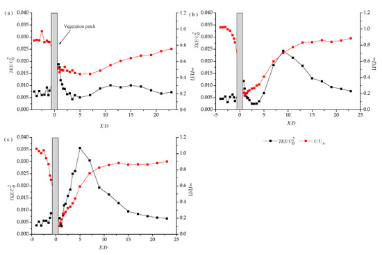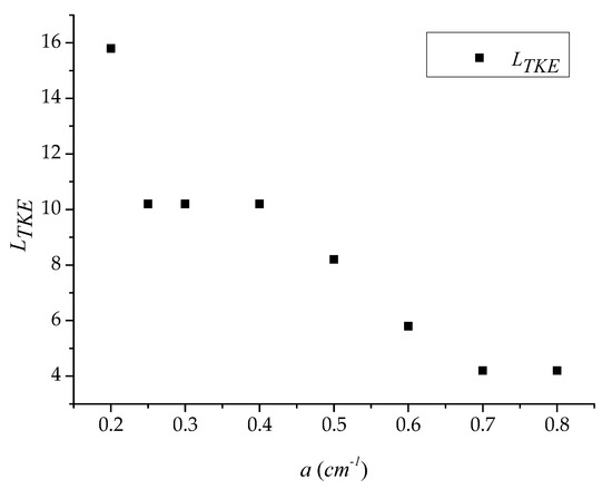 As TKEmax2 and TKEmax1 had opposing tendencies with increasing density (Figure 4), the following transition occurred. For low densities (a ≤ 0.3 cm−1), the turbulence reached the highest value immediately downstream of the patch; however, for a denser patch, the turbulence intensity was highest at some distance far from the patch [13,33].